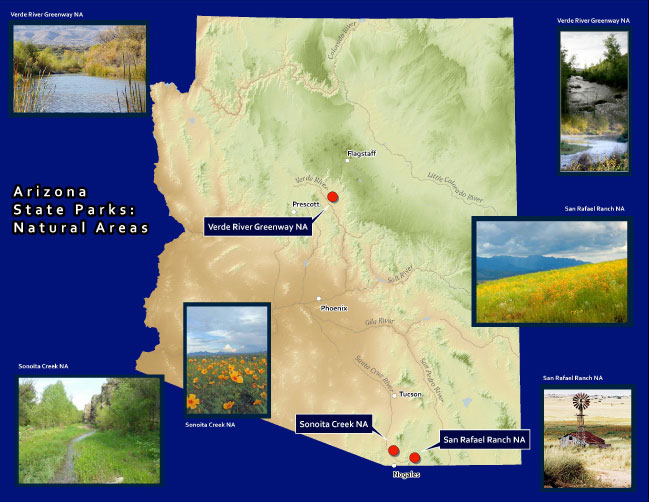 Arizona State Parks and Trails has 3 Natural Areas and a conservation easement (San Rafael CE). The three natural areas are Sonoita Creek State Natural Area, the Verde River Greenway State Natural Area, and the San Rafael State Natural Area.