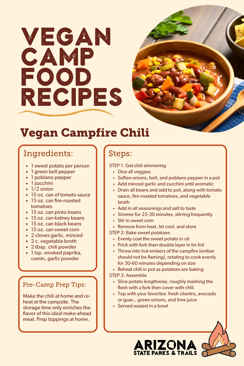 Try oiling then pricking a sweet potato before wrapping tightly in two layers of tin foil. Then toss those ‘taters in the hot embers and rotate frequently to cook without burning. When soft, top them with some vegan chili that you prepped at home and simply reheat over the fire. There’s a delicious, one-pot meal for the easy-cleanup win! Check our vegan camping recipes for a bonus dinner: delicious cauli tacos!