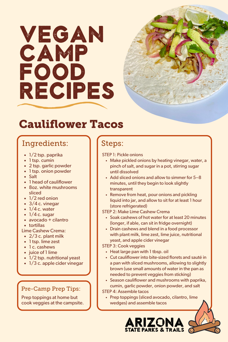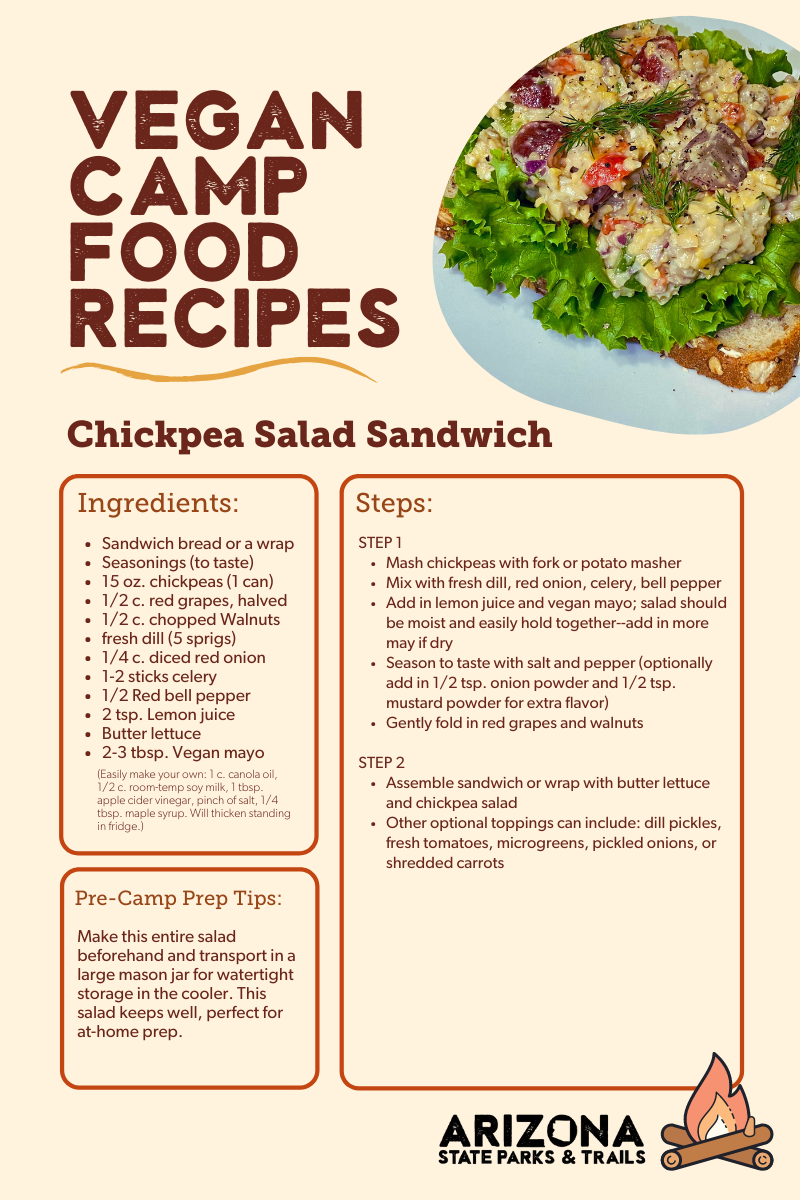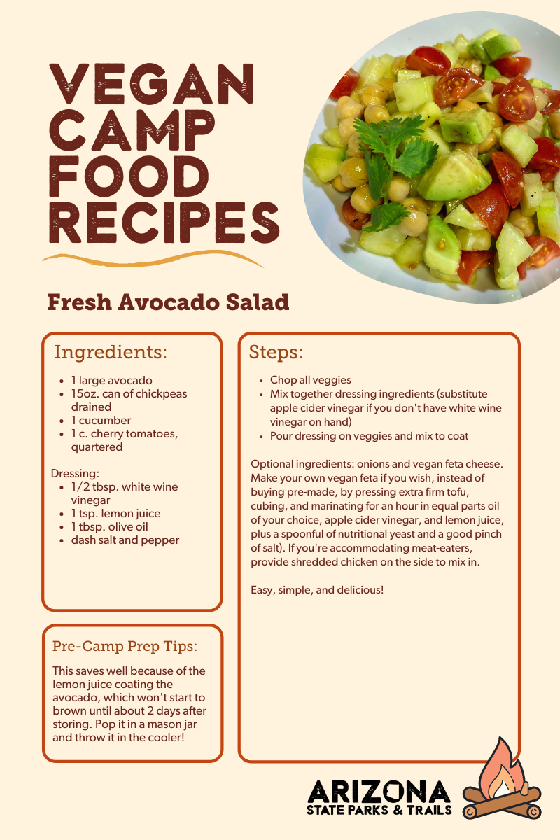 When you’re at the campsite and headed out for a hike, throw some salted nuts and dried fruit in your pack. Trail mix is a classic for a reason… it’s the perfect non-perishable vegan food for camping and hiking! The calories, healthy fat, and protein it provides will give you energy, and the salty seasoning will boost electrolytes when sweating under the heat of the Arizona sun on a trail.