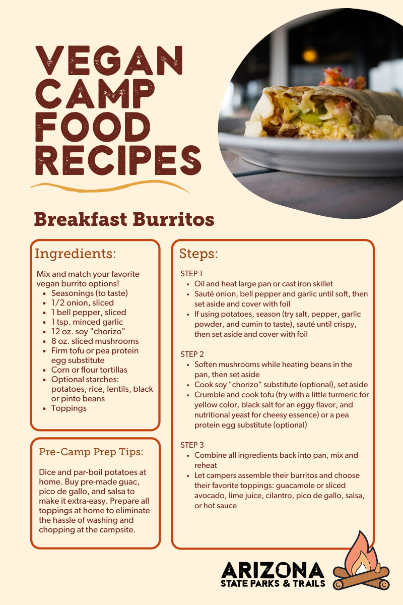 When it comes to meat-free, dairy-free, egg-free breakfasts, you might think options that will work at the campsite are slim. Enter the plant-based breakfast burrito! This is a fantastic option because everyone in the camping party can customize their burrito just how they like it. Try crumbled firm tofu or a pea protein egg substitute and spice things up with vegan soy chorizo. Or forgo the substitutes altogether and still throw together a filling and delicious burrito with fried potatoes (cubed and par-boiled at home to save prep-time at the campsite), bell-peppers, onions, black beans, and mushrooms.